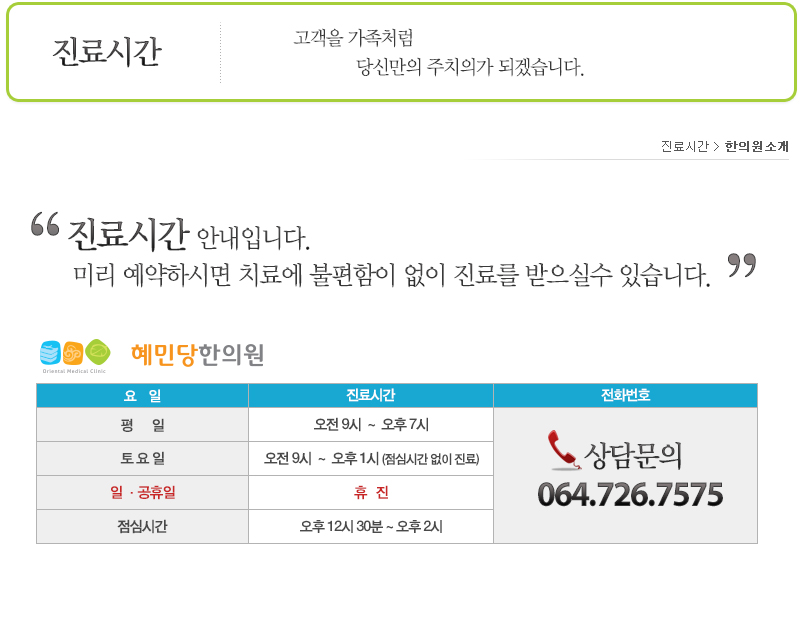 한의원명 : 혜민당한의원 주소 : 제주도 제주시 중앙로 326 해피트리빌딩 2층 사업자등록번호 : 616-92-89542